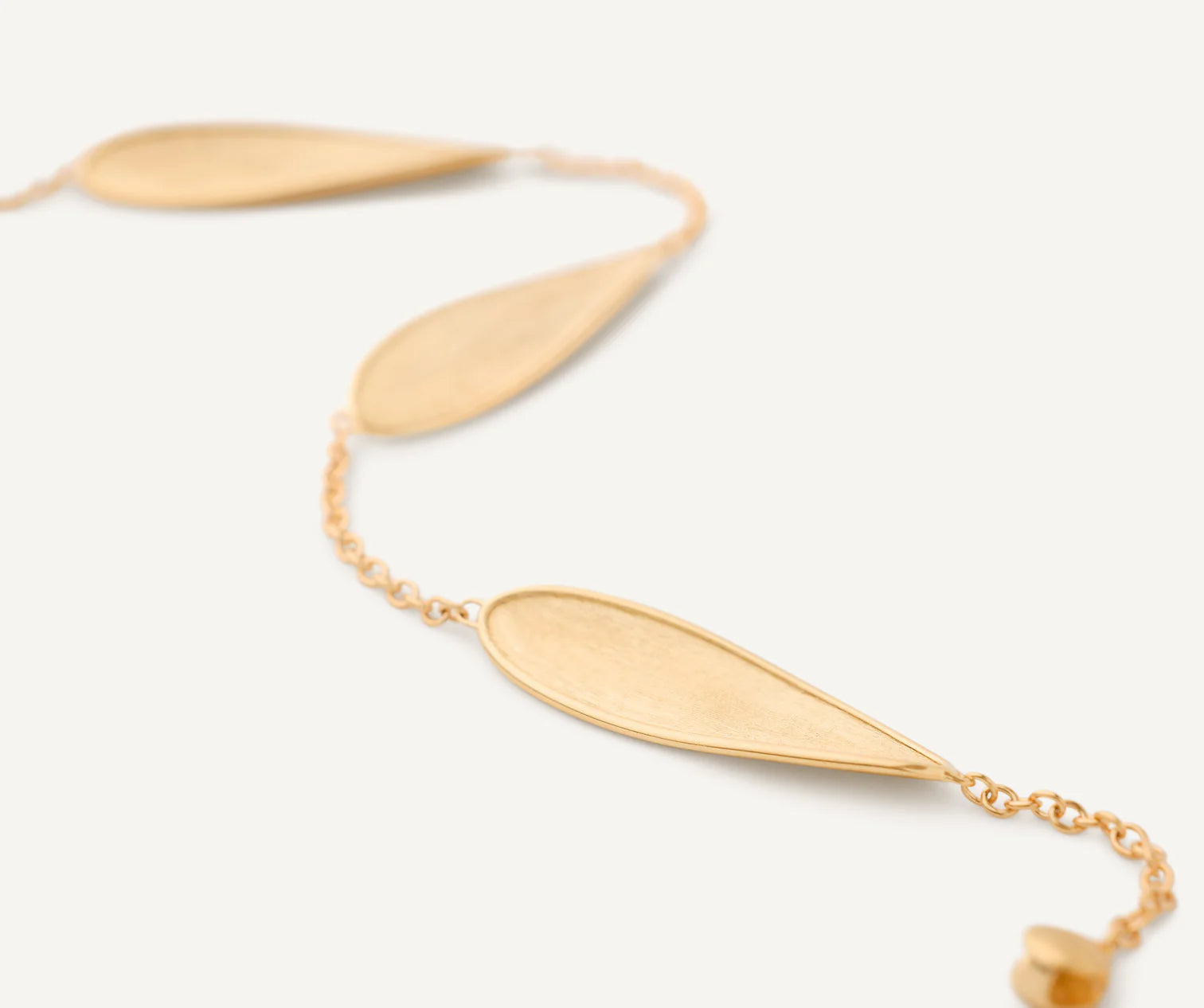 This 18kt yellow gold bracelet features a sculptural strand of delicately twisted leaves—each element inspired by the fluid movement of nature. Crafted in Italy using the ancient Florentine "bulino" engraving technique, its soft shimmer and graceful form make it a refined staple for everyday luxury.  This bracelet totals 7" in length.