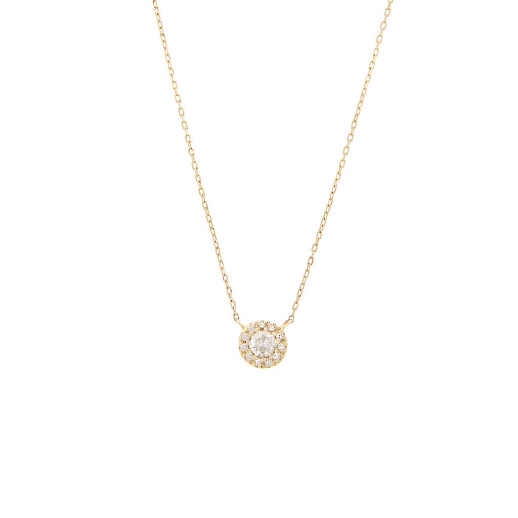 14kt yellow gold and diamond petite halo necklace.