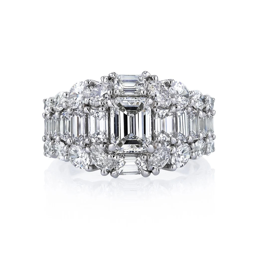 This elegant ring features a stunning 1.08 carat emerald-cut diamond at its center, certified by GIA with a G color and VVS1 clarity. The center stone is flanked by 12 additional emerald-cut diamonds totaling 2.09 carats, and 16 oval diamonds adding 1.73 carats of brilliance. Crafted in platinum, this ring showcases a sophisticated blend of shapes and sparkle, creating a timeless design that exudes luxury and refined beauty, perfect for those seeking a statement piece with a classic touch. Finger size 6 1/2.