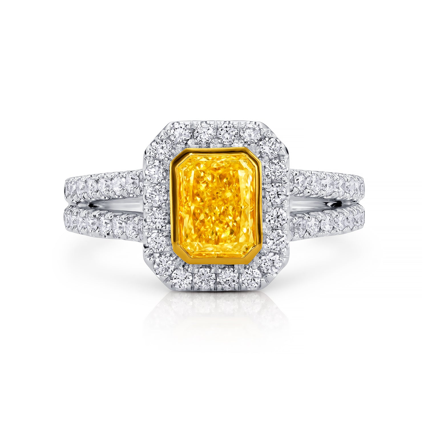This 18kt white & yellow gold ring features a radiant cut fancy light yellow diamond totaling 1.30ctw (VS1). The mounting is set with 56 colorless round diamonds that total 0.71ctw and cascade down the double row shank. The center stone is GIA certified and the finger size 6 1/2.