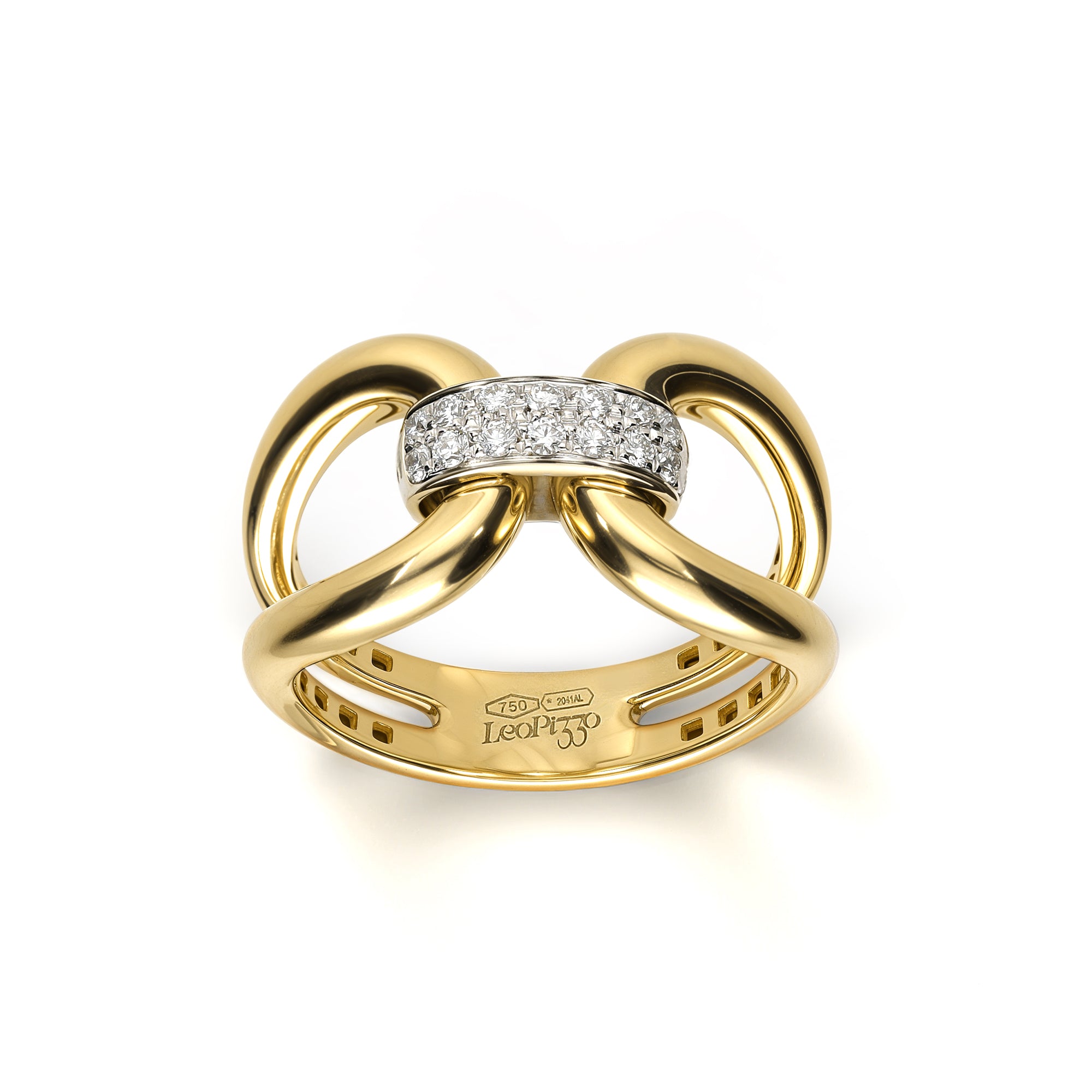18kt yellow gold double loop ring with an 18kt white gold and diamond connector.