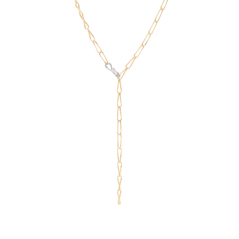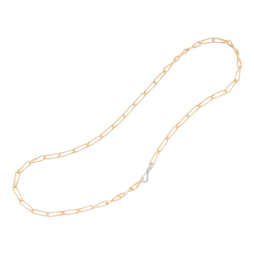This Marco Bicego Marrakech Onde necklace is made of 18k yellow and white gold. The necklace is comprised of twisted oval yellow gold links and a white gold clasp set with .50cts of diamonds. The necklace can be styled in two different ways: as a long necklace or as a lariat style necklace.  The total length measures approximately 29.5 inches long.