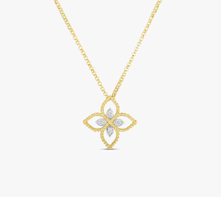 Delicate and refined, this Principessa necklace features a small flower motif crafted in 18kt yellow gold. Each bloom is accented with sparkling diamonds in white gold.