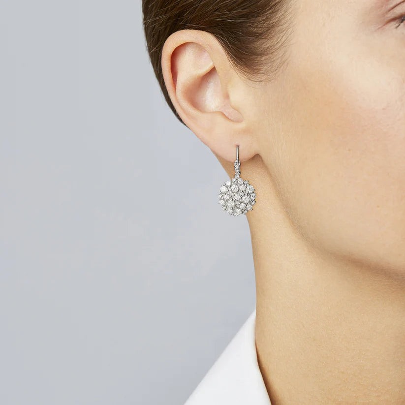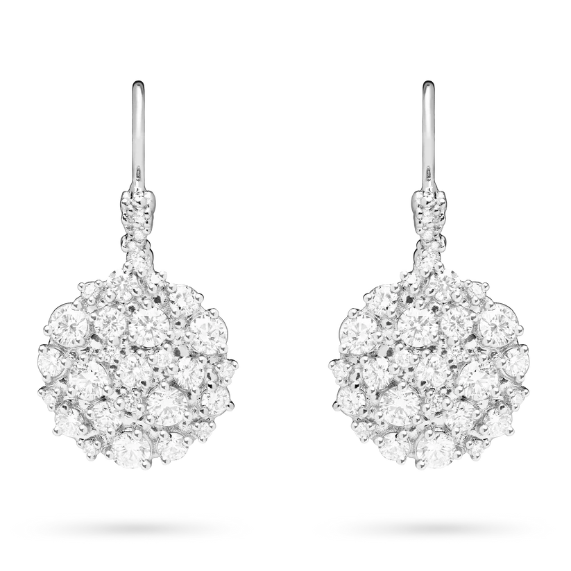 Confetti circle dangle earrings in 18kt white gold with brilliant cut white diamonds totaling 1.65 carats. 13mm wide; secured with a shepherds hook.