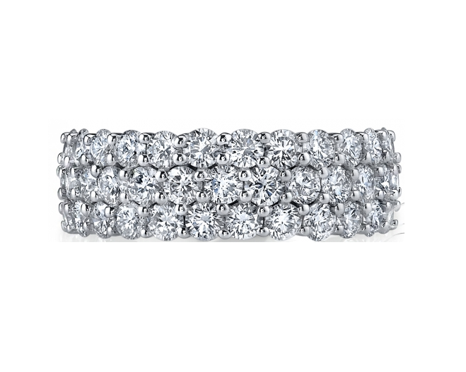 Platinum three row halfway band with 37 prong set round cut diamonds totaling 2.05cts.  The diamonds are H in color and SI1 in clarity.  Finger size 6.