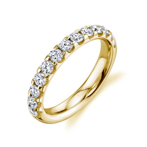 18kt yellow gold u-prong comfort fit halfway band set with 11 round brilliant cut diamonds.