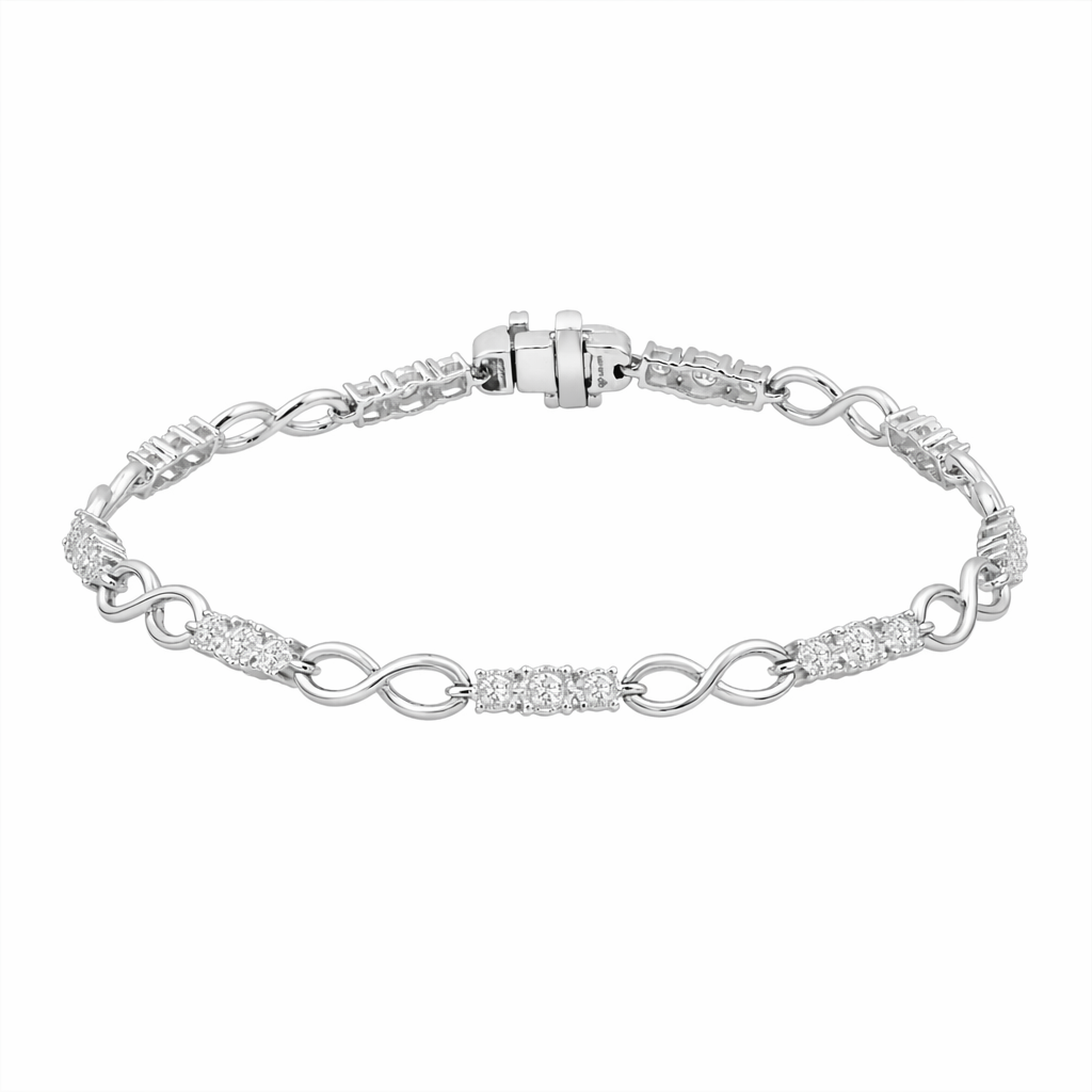 14kt white gold bracelet set with eight infinity links and 27 round brilliant diamonds totaling .79ctw.